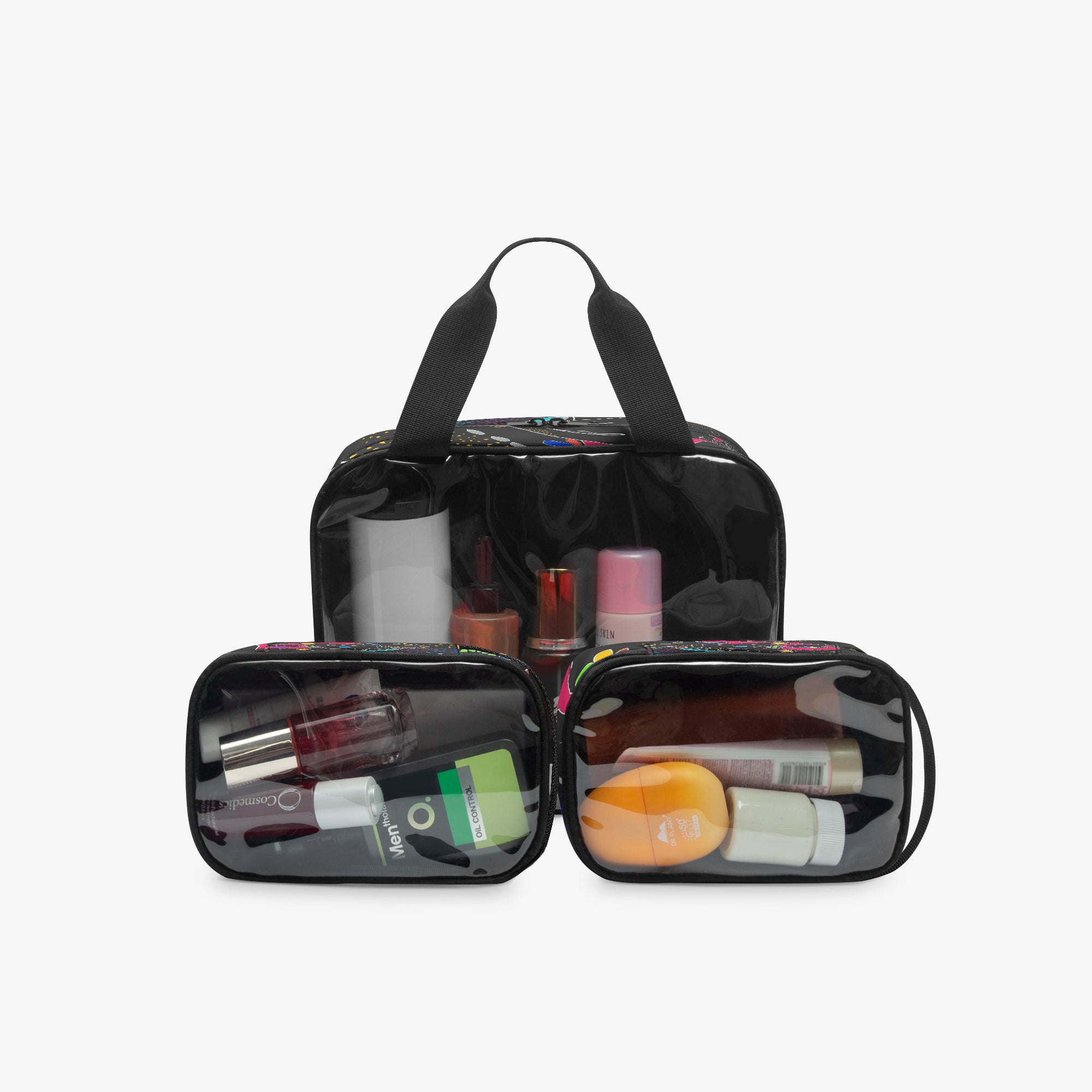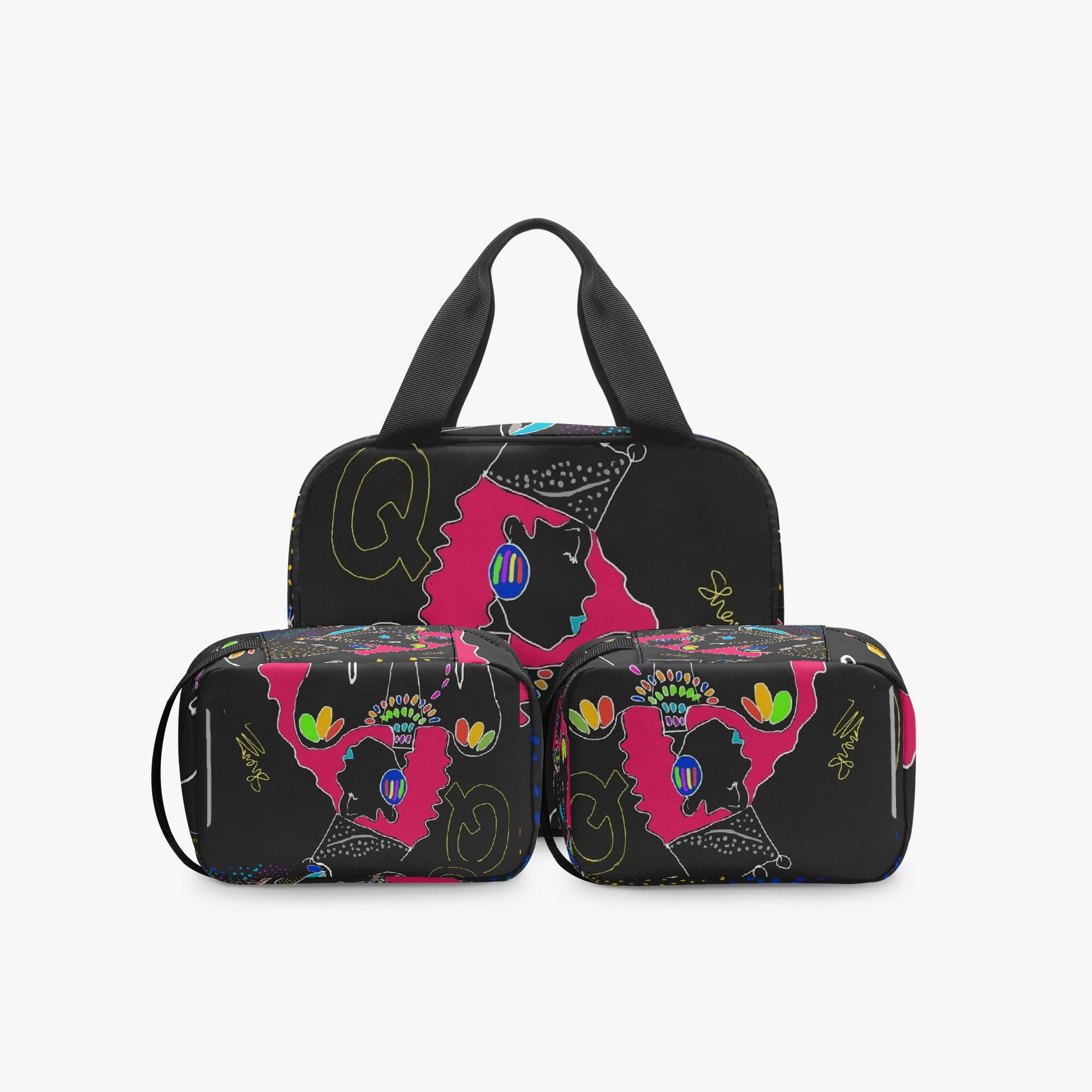 • The large bag is equipped with a hand strap, while the small bags can be held by hand or placed inside the large bag.